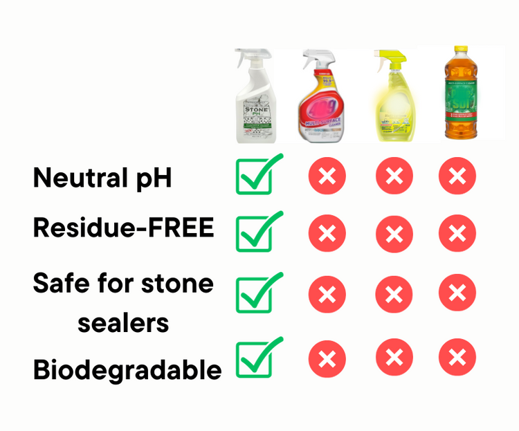 StonepH stands out from other cleaners with its specialized pH neutral formula, ensuring it's as gentle on your stone surfaces as it is tough on dirt. While other cleaners can be harsh and risk damaging the sealant or stone, StonepH offers peace of mind with its family and pet safe ingredients. Simplify your routine with a cleaner that's designed for effectiveness and safety, leaving competitors in the dust.